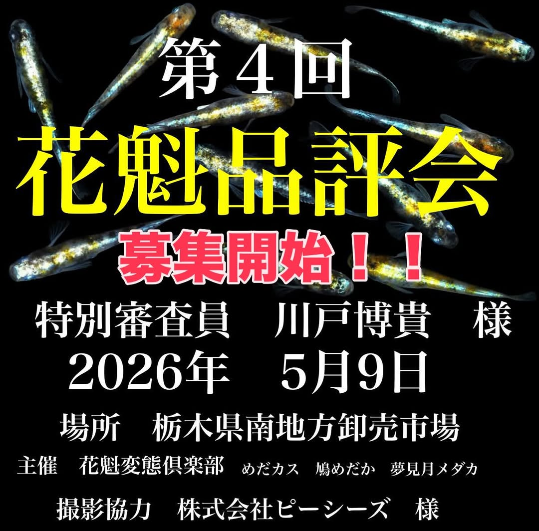 第4回花魁品評会 関東 2026.05.09 【管理人による代理投稿】主催者様に代わって事務局(あみちゃん)が情報を登録しています。 主催:めだカス 📱 SNSを確認 第4回花魁品評会 開催日 🗓️ カレンダー 2026年5月9日 土 開催時間 09:00 ~ 13:00 開催場所 📍 MAP 栃木県南地方卸売市場 栃木県 小山市下河原田 954 イベントの見どころ 今年も全身全霊を尽くして花魁品評会を開催しますので宜しく お願いします!! 募集期間は4月26日(日)までとさせて頂きます。 下記読んで頂いてエントリーしてくださいませ 会場の地図 スポンサーリンク 🐟 メダサポは全国の「メダ活」を応援しています! 🐟